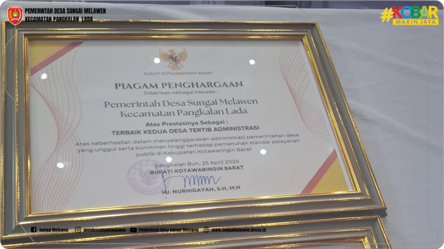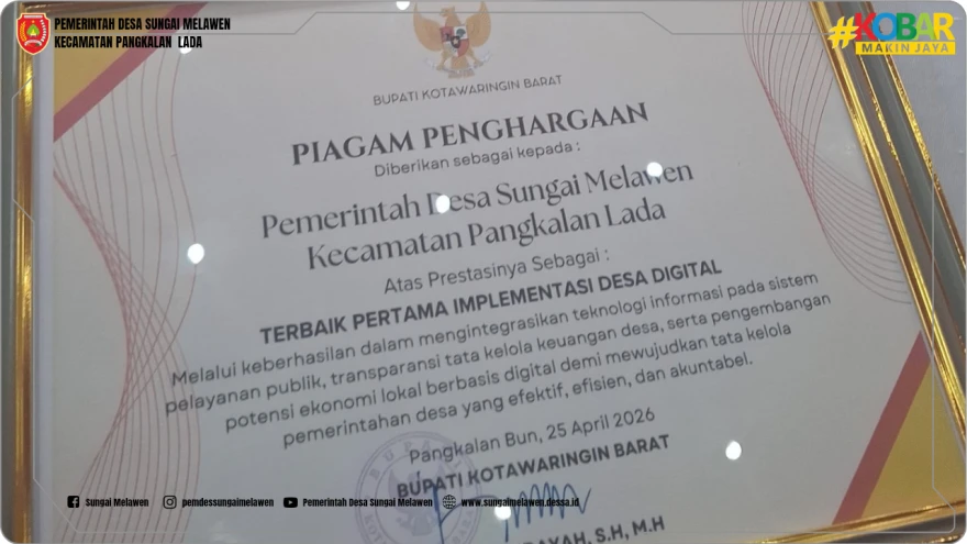Pemerintah Desa Sungai Melawen kembali mencatat prestasi membanggakan. Desa ini berhasil meraih dua penghargaan bergengsi sekaligus, yaitu sebagai Perungkat Dua Desa Tertib Administrasi dan Peringkat Pertama Implementasi Desa Digitalisasi pada acara Launcing Transaksi Keuangan Non Tunai Bagi Pemerintah Desa Se Kabupaten Kotawaringin Barat yang diselenggarakan oleh Dinas Pemberdayaan Masyarakat dan Desa Kabupaten Kotawaringin Barat.